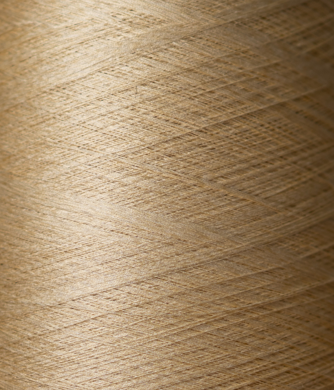 2022年にスタートした生糸の事業展開です。“生成りの黄色”という色にコンセプトの軸を置いたオリジナルの3本合わせの糸は、家蚕糸と野蚕糸が合わさった、独特の色味と風合いに仕上がりました。また、自社商品に対しては、環境に配慮した仕組みを考えております。